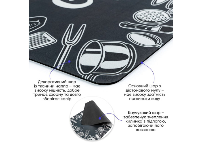 • Каучуковий шар – забезпечує зчеплення килимка із підлогою, запобігаючи його ковзанню на гладких або слизьких поверхнях.