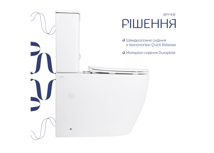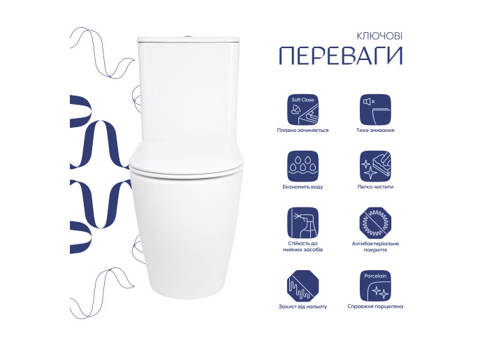 Унітаз: кераміка. Сидіння для унітазу: дюропласт. Бачок: кераміка
