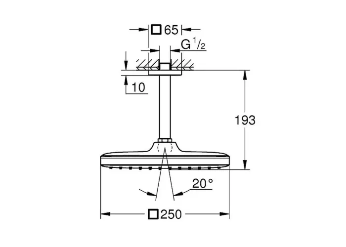 Ширина лійки верхного душа, мм 250