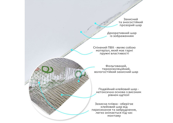 • Захисна плівка – оберігає клейовий шар від пересихання та забруднення, легко знімається під час монтажу.