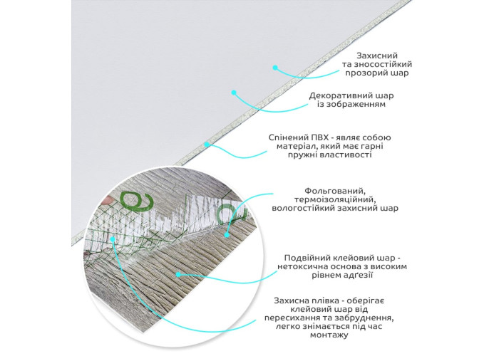 Захисна плівка – оберігає клейовий шар від пересихання та забруднення, легко знімається під час монтажу.