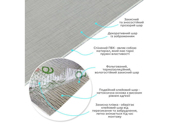 • Фольгований шар: основна властивість цього шару – відображення теплових хвиль, що дозволяє мінімізувати теплові втрати, тим самим покращити теплоізоляцію приміщення.