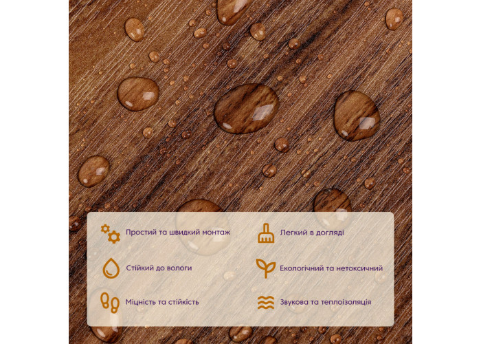 • Стійкість до вологи: вінілова плитка під ламінат стійка до вологи, що робить її відмінним вибором для кухні та інших приміщень з підвищеною вологістю, матеріал стійкий також до впливу пари та до появи плісняви.