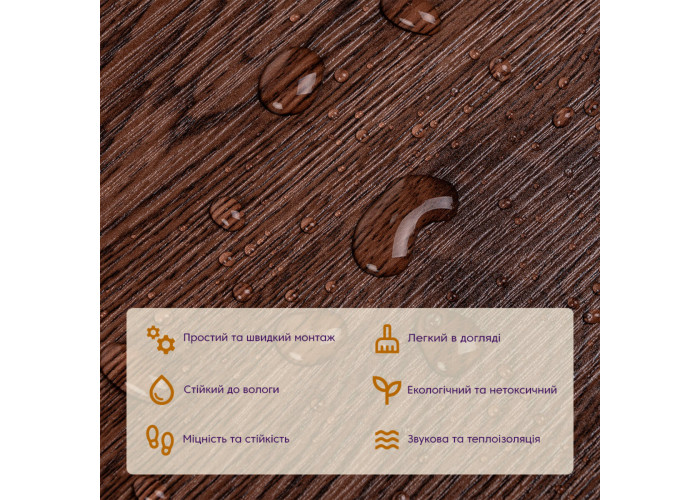 • Стійкість до вологи: вінілова плитка під ламінат стійка до вологи, що робить її відмінним вибором для кухні та інших приміщень з підвищеною вологістю, матеріал стійкий також до впливу пари та до появи плісняви.