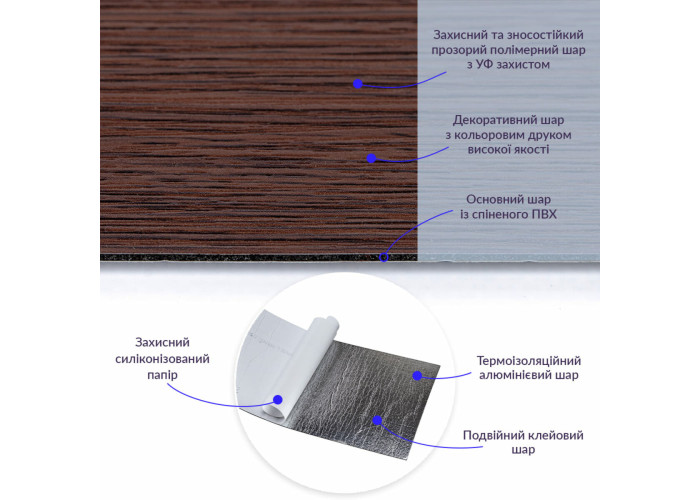 • Фольгований шар: основна властивість цього шару – відображення теплових хвиль, що дозволяє мінімізувати теплові втрати, тим самим покращити теплоізоляцію приміщення.