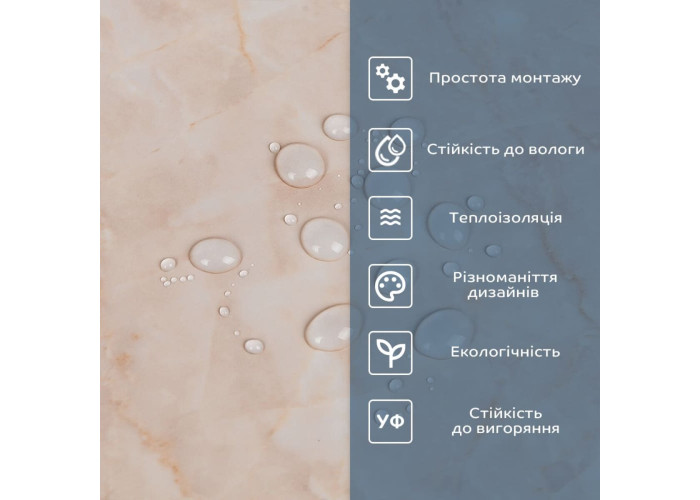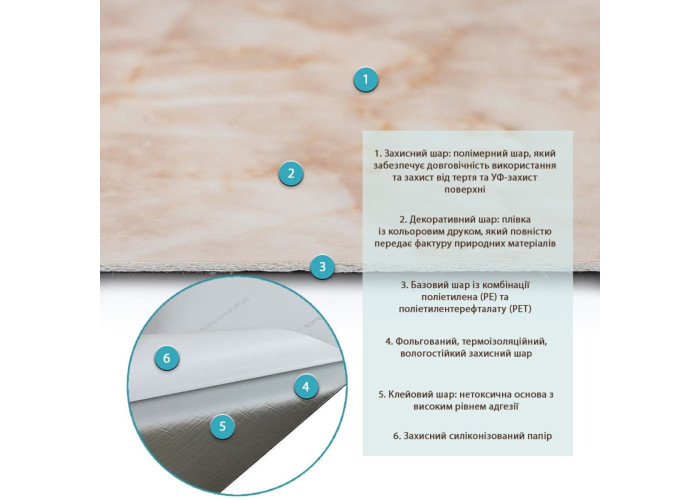 - Декоративний шар: плівка з кольоровим друком високої якості, яка повністю імітує фактуру природних матеріалів завдяки чіткому та деталізованому зображенню.