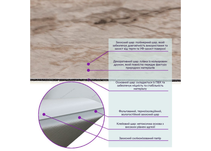 - Полімерний шар: захищає від потертостей та дрібних механічних пошкоджень, забезпечує довговічність використання, а УФ захист допомагає запобігти вигоранню, зберігаючи колір насиченим.