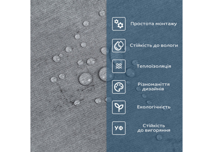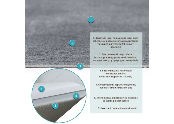 - Полімерний шар: захищає від потертостей та дрібних механічних пошкоджень, забезпечує довговічність використання, а УФ захист допомагає запобігти вигоранню, зберігаючи колір насиченим.