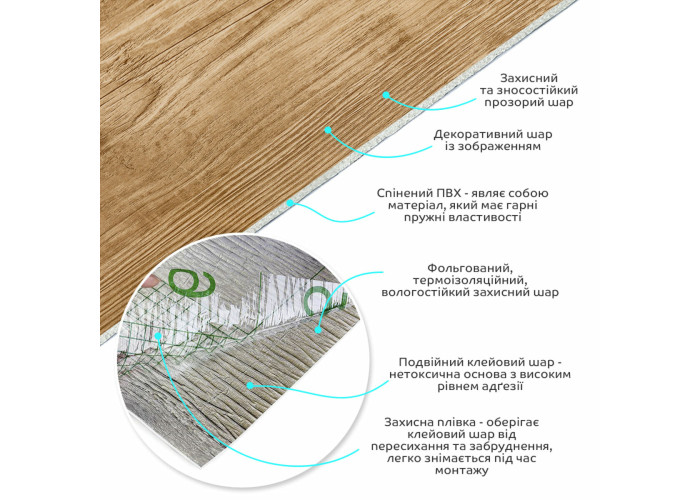 • Полімерний шар, що захищає від потертостей та дрібних механічних пошкоджень, забезпечує довговічність використання, а УФ захист допомагає запобігти вигоранню, зберігаючи колір насиченим, за рахунок чого плитка довго має свій первісний естетичний вигляд.