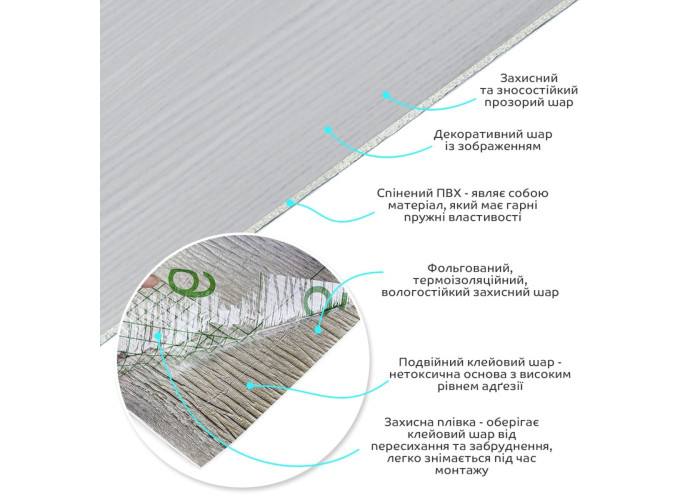 • Декоративний шар: плівка з кольоровим друком високої роздільної здатності, яка повністю імітує фактуру природних матеріалів завдяки чіткому та детальному зображенню.