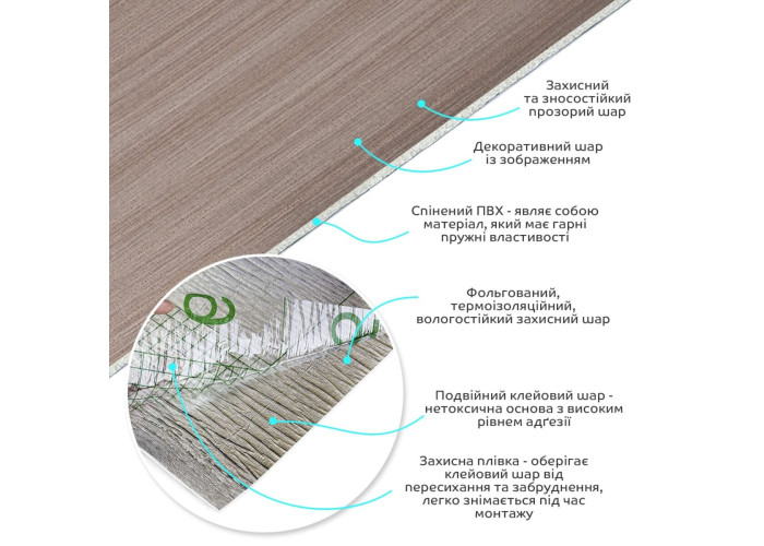 • Декоративний шар: плівка з кольоровим друком високої роздільної здатності, яка повністю імітує фактуру природних матеріалів завдяки чіткому та детальному зображенню.