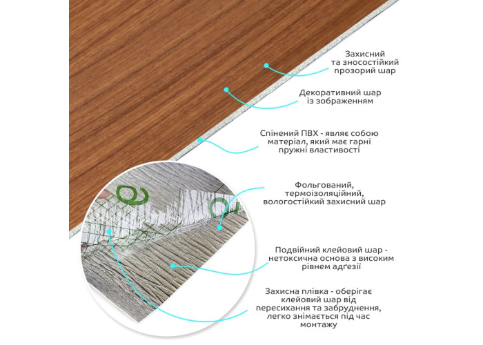 • Захисна плівка – оберігає клейовий шар від пересихання та забруднення, легко знімається під час монтажу.