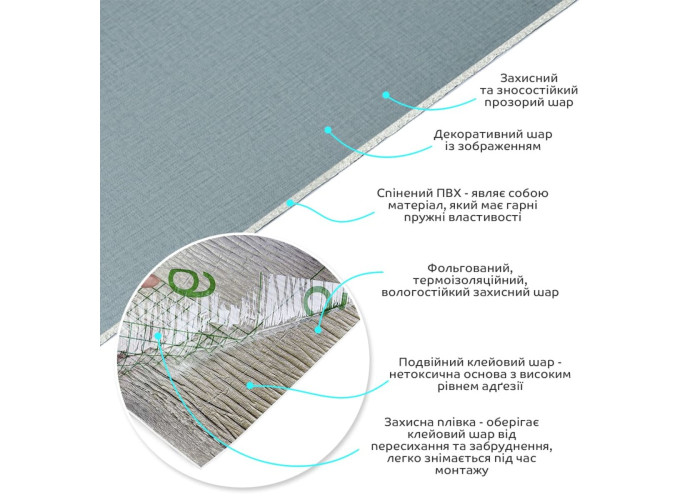 • Захисна плівка – оберігає клейовий шар від пересихання та забруднення, легко знімається під час монтажу.