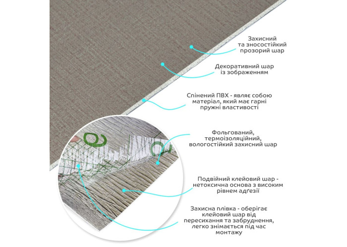• Декоративний шар: плівка з кольоровим друком високої роздільної здатності, яка повністю імітує фактуру природних матеріалів завдяки чіткому та детальному зображенню.