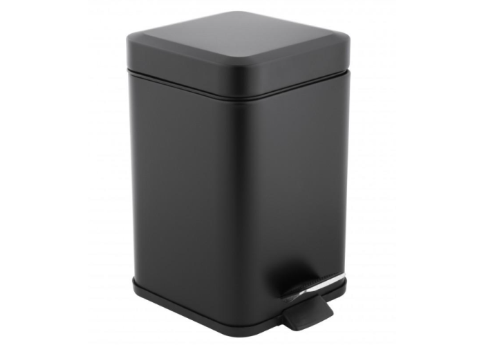 Сучасний кошик для ванної із чорної сталі з порошковим покриттям. Місткість з ідеально гладким, матовим покриттям. Сучасна квадратна форма кошика. Завдяки зручній педалі ми можемо відкривати кришку без використання рук. Усередині кошика знаходиться чорний пластиковий контейнер із практичною ручкою, що полегшує спорожнення кошика. Основа всього виробу виконана із пластику, який не подряпає поверхню підлоги у ванній чи туалеті. На задній частині кошика є рухома металева ручка для перенесення чи підвішування кошика.