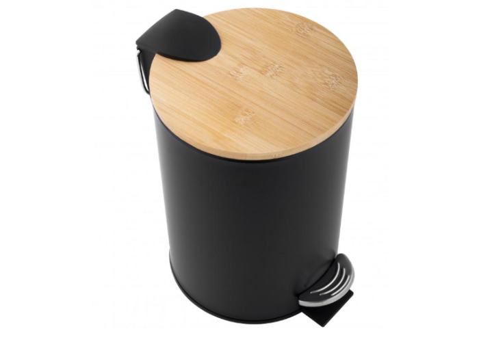 Сучасний кошик для ванної кімнати виготовлений із сталі з порошковим покриттям та натурального бамбукового дерева. Чорний контейнер із ідеально гладким матовим покриттям. Кришка з бамбукового дерева надає неповторного вигляду всьому виробу. Завдяки зручній педалі ми можемо відкривати кришку без використання рук. Усередині кошика знаходиться чорний контейнер, що має практичну ручку, завдяки якій корзину легше випорожнити. Основа всього виробу виконана із пластику, який не подряпає поверхню підлоги у ванній чи туалеті. Позаду кошика є додаткова металева ручка для перенесення чи підвішування кошика.