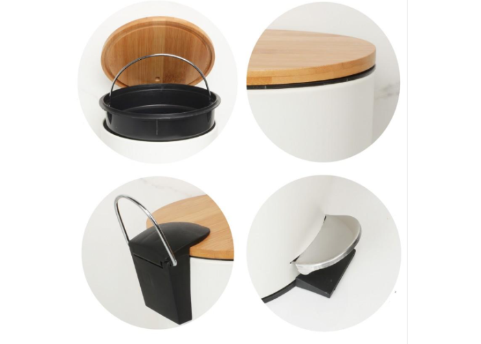 Сучасний кошик для ванної кімнати виготовлений із сталі з порошковим покриттям та натурального бамбукового дерева. Контейнер із ідеально гладким матовим покриттям. Кришка з бамбукового дерева надає неповторного вигляду всьому виробу. Завдяки зручній педалі ми можемо відкривати кришку без використання рук. Усередині кошика знаходиться чорний контейнер, що має практичну ручку, завдяки якій кошик легше випорожнити. Основа всього виробу виконана із пластику, який не подряпає поверхню підлоги у ванній чи туалеті. Позаду кошика є додаткова металева ручка для перенесення чи підвішування кошика.