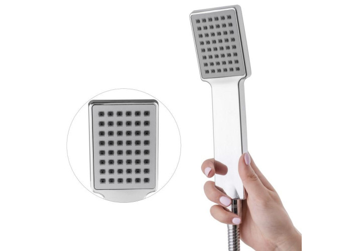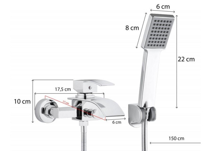 Сучасний набір з настінним змішувачем для ванни та ручним душем. Він включає механічний змішувач з перемикачем виливу / ручного струменя води і душовий набір з ручним душем і шлангом довжиною 150 см зі з'єднанням 1/2 дюйма. Фіксований плоский носик з водоспадом ефект. Змінна керамічна головка діаметром 30 мм забезпечує довговічність та надійність. Дизайн набору відповідає останнім тенденціям – він виглядає дуже елегантно та чудово вписується у сучасну ванну кімнату.