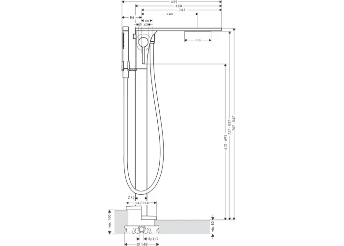 складається з: змішувач змішувач для ванни підлоговий, ручний душ-"паличка", шланг для душу, тримач для душу;