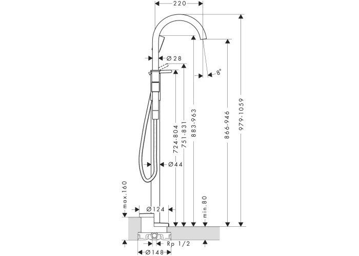 складається з: змішувач змішувач для ванни підлоговий, ручний душ, шланг для душу, тримач для душу;