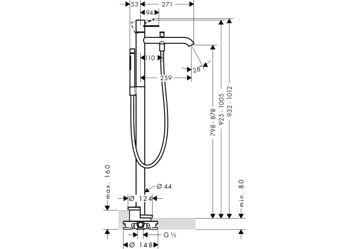 складається з: одноважільний змішувач для ванни підлоговий, ручний душ-"паличка", шланг для душу, тримач для душу;