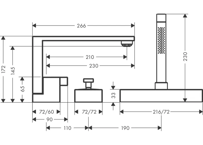 складається з: одноважільний змішувач на край ванни на 3 отвори, ручний душ-"паличка", тримач для душу;